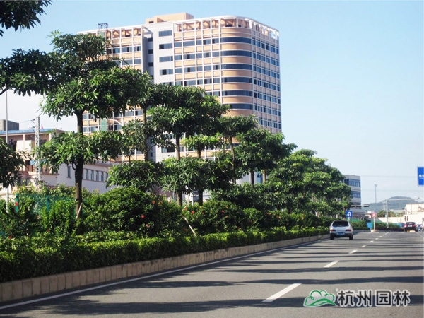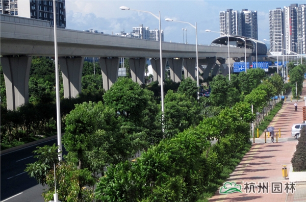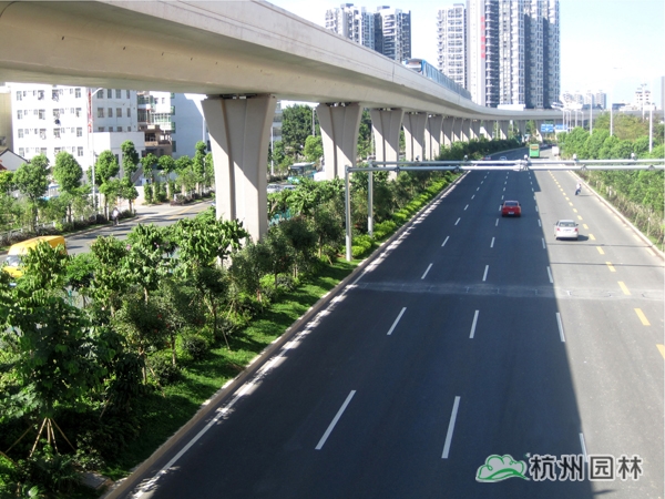 該工程位于國道205深圳段龍崗區(qū)地鐵三號線愛聯(lián)地鐵站至坪地與惠州市交界處,施工內(nèi)容包括綠化種植、綠化噴灌與管道安裝等。植物配置遵循適地適樹的原則,并充分考慮與城市風格的吻合,兼顧多樣性和季節(jié)性,通過多層次、多品種的搭配,營造出處處有綠葉、無處不飛花,一路風景變化萬千的城市景觀帶。