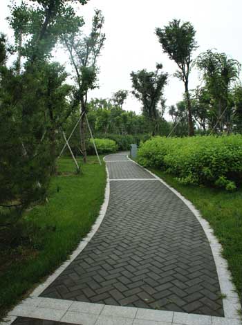 而在道路十字路口的節(jié)點處,則主要是用10cm×10cm的小花崗巖鋪地,鋪出來的路面整潔、平坦,看似簡單,實則對施工技術要求相當高。草坪中的地面鋪裝,則采用花崗巖汀步,用錯縫鋪裝法,兩塊花崗巖之間用草皮鑲嵌,就像給每塊花崗巖鑲了一道綠邊,與旁邊的草坪和諧地融為一體。貫穿整個工程的游憩步道,全部采用“人字形”的鋪裝方法,中間用透水磚、兩邊以花崗巖鑲邊,透水磚價格不高,用以鑲邊的花崗巖是利用了鋪裝中剩余的邊料,雖然用料簡單,但通過對技術的嚴格要求,鋪出的路面卻整潔而不失韻味,是一種實用、環(huán)保、節(jié)約的做法。