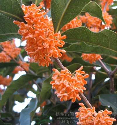 “火煉金丹”桂花:常綠小喬木,高3-5米,冠形、葉型似金球桂,觀賞性狀良好;零星分布于江蘇、浙江、江西一帶,適應性廣泛。本品種花冠裂片邊緣金黃色,其他部分橙黃色,為桂中珍品,用于園林綠化點綴,效果極佳。