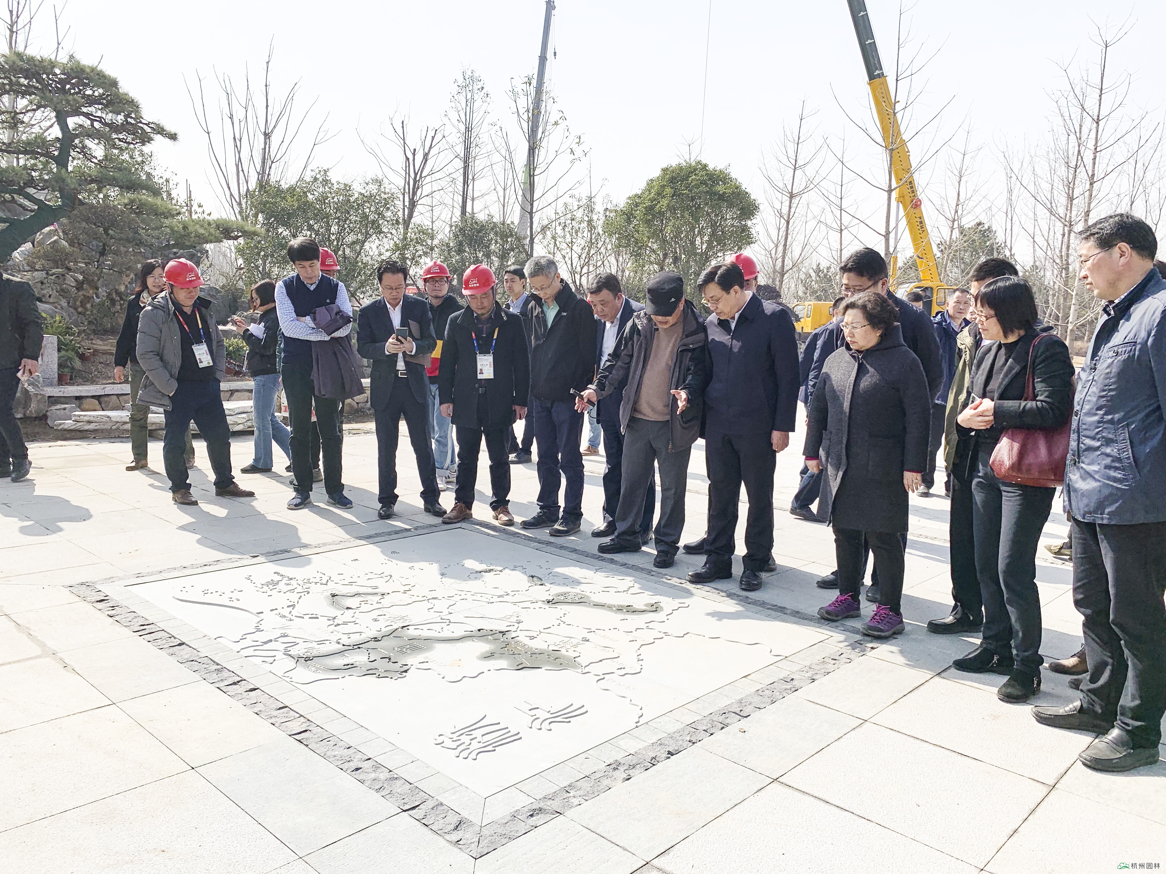 浙江省委常委、常務副省長馮飛(右二)聽取現(xiàn)場情況介紹,杭州園林董事長吳光洪(右一)陪同