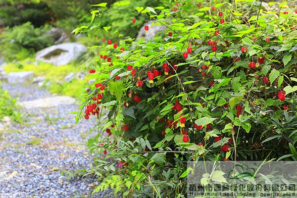 紅萼苘麻的花朵就像一個(gè)個(gè)紅燈籠,使原本沉悶的石頭充滿(mǎn)了自然的野趣。