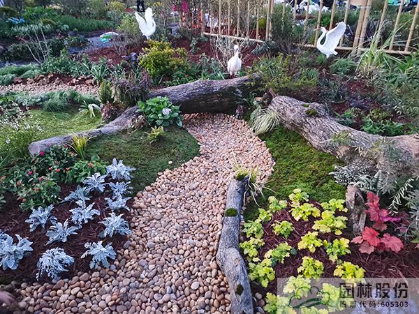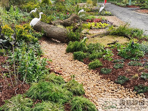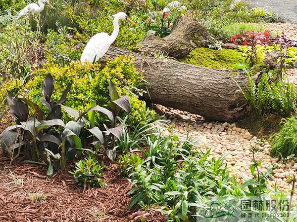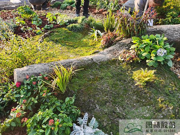 ①模擬苔蘚植物的生境條件,將蘚類濕地景觀與枯木結合,在枯木與卵石道路交叉部位布設小水塘,保持苔蘚生長環(huán)境土壤濕度。