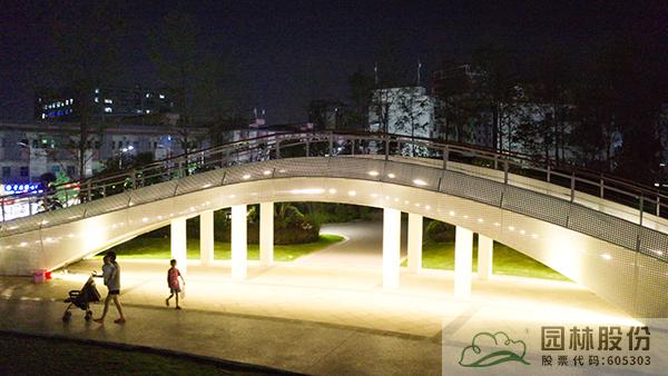 一座人行天橋,將公園景觀一分為二,動(dòng)靜結(jié)合,相得益彰。既劃分空間,又是公園景觀的一部分。
