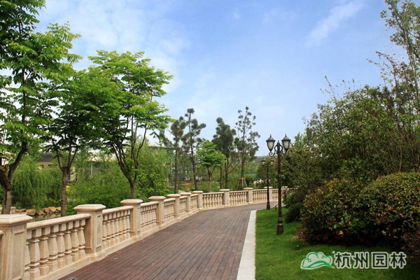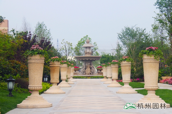 該工程位于杭州城北石祥路與蔡馬河交匯處,為大型綜合性園林景觀工程,內(nèi)容包括園林建筑、苗木種植、硬質(zhì)鋪裝、疊石跌水、景觀小品、土坡造型等。該項(xiàng)目景觀全方位采用規(guī)則式與自然式融合的維多利亞園林風(fēng)格,如夢(mèng)似幻,華貴雍容,將維多利亞皇家園林景觀特征表現(xiàn)得淋漓盡致。