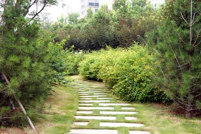每個景觀節(jié)點上,植物的配置方法都是不一樣的,如在下沉廣場,主要是以小龍柏、金葉女貞等小灌木片植成方形或弧形,間或點綴石楠、梅樹,看起來規(guī)整、簡潔;而在設計風格為江南園林的南廣場上,是將貴重的造型油松單植,通過不同的組合,形成三個風格相近的綠島,周邊種植美人蕉、玉簪、竹子,并砌起白墻,上面開圓形拱門或圓窗,散發(fā)出詩意江南的靜謐和婉約氣息。“游憩步道是貫穿整個景觀的軸線,為了形成曲徑通幽的景觀效果,我們將對植、孤植、叢植都多種方法結合運用,特別是在三叉路口,多種植海棠、櫻花、杏花等,一方面,花開的時候,綠葉間繁花點點,會吸引人們不斷向前探尋更多的美景;而花落之后,茂密的枝葉又形成隱隱約約的視覺感受,前方轉過彎后風景什么樣,又讓人很想去看看?!备呓浝硇χf。
