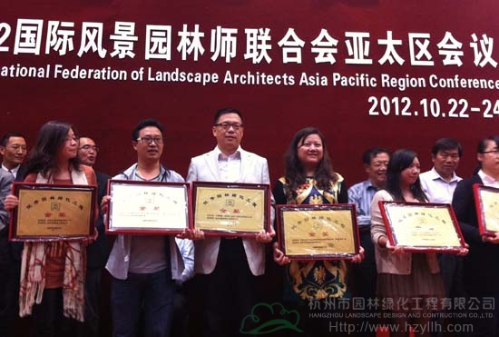 2012年度中國風景園林學會“優(yōu)秀園林工程獎”共頒出獲獎項目195項,其中,“優(yōu)秀園林綠化工程獎”185項,“優(yōu)秀園林古建工程獎”10項。杭州市園林綠化工程有限公司承建的中國鐵建?國際城(杭州)示范區(qū)園林綠化工程和深圳市國道205深圳段改建工程景觀綠化工程G5402標段雙雙榮獲金獎。