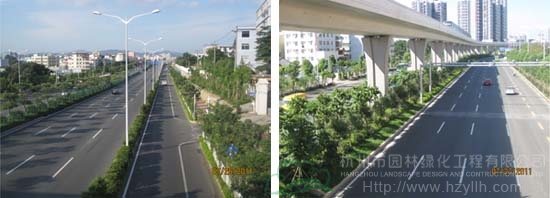 國道205深圳段改建工程景觀綠化工程G5402標段,是深圳市龍崗區(qū)迎大運重點景觀工程,位于國道205深圳段龍崗區(qū)地鐵三號線愛聯(lián)地鐵站至坪地與惠州市交界處,總綠化面積210000㎡?!耙匀藶楸?,尊重自然”、“ 處處有綠葉、無處不飛花”等設計理念貫穿于工程始終,整條中央綠化帶位于高架橋下,長勢茂盛的各類植物形成一條色彩繽紛的彩帶擁簇著高架橋段,使整條橋段與綠化景觀有機融合。整條道路的景觀,不僅體顯出一個濱海大都市獨有的景觀特色,更彰顯出這個城市的生機活力與熱情奔放。