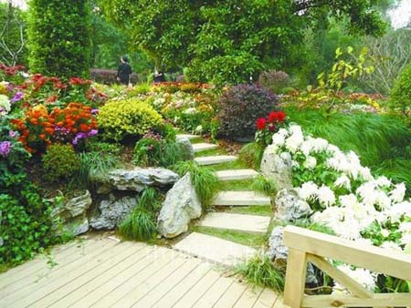 這片鋪滿白色石子的空地,有日本枯山水庭院的感覺,更重要的是,它是孩子們的最愛,一個個活潑可愛的孩子走到這里時總要盡情地蹦上幾下,或者蹲下去把玩小石子,開心的笑容,讓留戀花間的蝴蝶也黯然失色??蓯鄣暮⒆印嵃椎氖?、紅色的景墻、燦爛的花卉,這種溫馨的畫面唯有在自家的庭院里,才會這樣的無拘無束。