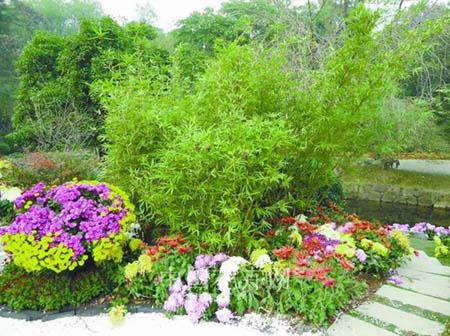 《綠廬》面積只有約400平方米,但植物配置極為豐富,在充分利用原有的桂花、櫻花、羅漢松、竹子等植物的基礎上,又加入了彩葉冬青、厚皮香、銀霜女貞、紅葉扶桑、龜甲冬青、紅花檵木、美人蕉、蘭花三七、沿階草、金邊胡頹子等幾十種植物與菊花相配置,形成了色彩絢麗、層次飽滿、清新雅致的庭院景觀?!斑@次應用的菊花品種有二、三十種,主要有綠牡丹、春日見山、金龍騰云、白萬勝、紅切花、紅衣錦繡……顏色有紅、綠、粉、紫、黃等,通過不同的配植手法,營造出五彩斑斕、生機無限、高潔清雅的美景,讓人絲毫感覺不到秋之凋零,反而像是暢游春之繁花勝景?!痹撠撠熑诵χf。