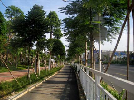 眼前的這條道路開闊大氣、綠色生態(tài),而當(dāng)初施工時,卻面臨著很多難題。該項目定位較高,工期短,交叉施工嚴(yán)重,更經(jīng)歷了濱海的臺風(fēng)季節(jié)天氣,所以施工中對施工工序組織、材料組織及機(jī)械勞動力的組織顯得尤為重要;由于施工范圍處于交通繁忙的205國道深圳段,對施工現(xiàn)場車輛的疏導(dǎo)及路邊作業(yè)的圍護(hù)等的要求都需嚴(yán)格把控;為了保證景觀效果,對苗木的要求比較高,很多假植的苗木需要用保鮮的方法長途運載到施工現(xiàn)場進(jìn)行種植?!笆┕ぶ忻媾R的各種不利因素不但增加了工程成本,更加大了施工難度,但在項目部全體人員工的共同努力下,最終克服種種困難,圓滿完成了任務(wù),展現(xiàn)了杭州市園林綠化工程有限公司優(yōu)質(zhì)高效、創(chuàng)新進(jìn)取的企業(yè)形象,受到各方的一致好評?!毙煜蛎鞯囊环喍淘捳Z,卻讓我們感受到了施工期間的諸多辛苦。
