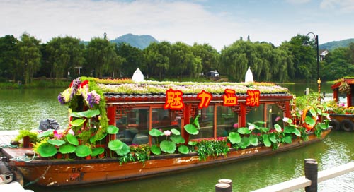 藝術(shù)節(jié)期間,首次在西湖湖面上配置的6艘荷花花船,極大地提高了荷花節(jié)的觀賞性和趣味性,成為西湖中一道流動的荷花美景。其中,由杭州市園林綠化股份有限公司設(shè)計制作的“魅力西湖”荷花游船,將插花技藝與園林布景手法有機結(jié)合,用康乃馨、勿忘我、太陽花等與荷花組景,既突顯了“主角”荷花的秀麗、典雅,又使整艘船的色彩明艷豐富,將熱鬧的節(jié)日氛圍巧妙烘托。