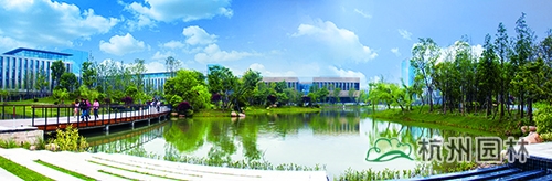 華為杭州二期生產(chǎn)基地景觀工程位于杭州市濱江區(qū)。走進工程現(xiàn)場,只見一棵棵銀杏、香樟、桂花生長得郁郁蔥蔥,昭示著無限的生機與活力;風格多樣的鋪裝,相映成趣,蜿蜒延伸;波光粼粼的人工湖中,幾只黑天鵝悠閑地游來游去,是風景的主角;色彩繽紛的黃色、白色、粉色花朵,營造出夏日的花海景觀……不是公園勝似公園的園林美景,營造出一個郊外原野般的自然空間。