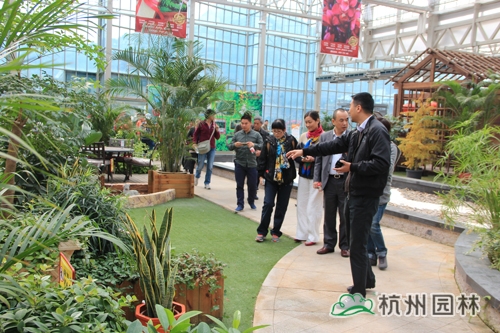 第二天,考察團在杭州市園林綠化股份有限公司總裁張炎良、副總裁丁旭升的陪同下參觀了畫境·青山湖花園中心。該花園中心是一個集園藝產(chǎn)品研發(fā)、展示和推廣的現(xiàn)代園林高新技術(shù)平臺,致力于打造庭院設計、咨詢、建造、養(yǎng)護等各類功能綜合的一站式園藝服務中心。項目有近3000畝配套生產(chǎn)基地,12000平米研發(fā)與生產(chǎn)溫室,以及室內(nèi)情景展示區(qū)、園藝展示區(qū),室外陳列展示區(qū)、應用展示區(qū)等多個功能區(qū)塊。其中,用于室內(nèi)園藝展示的4000平方米的展覽溫室,引進荷蘭PRINS溫室技術(shù),實現(xiàn)對溫度、光照等全智能控制,是一個技術(shù)含量極高的節(jié)能、環(huán)保型現(xiàn)代溫室。