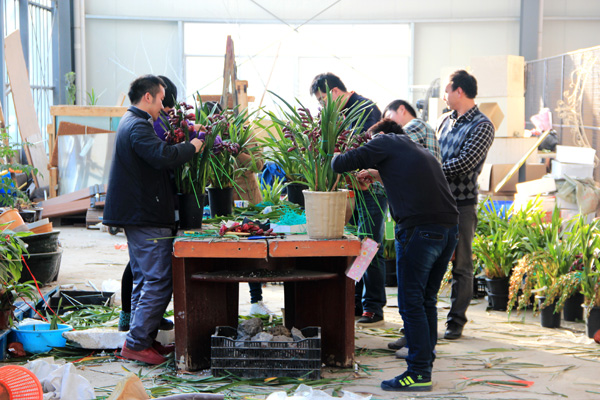員工組盆現(xiàn)場:一盆盆精美的花卉從他們手中誕生
