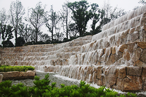 入口水景開闊大氣,行道樹陣整齊劃一。一場歌劇的序曲,不管是澎湃激昂,還是歡快活躍,抑或是柔情舒緩,都將對整個局情起著舉足輕重的作用。入口景觀的作用同樣如此,它是整個園林工程留給人們的第一印象。走進(jìn)項(xiàng)目主入口,寬40米、高10米的寬闊水景,高達(dá)7級的層階落差,水流層層跌落間,水聲轟鳴,仿佛一道瀑布橫掛眼前。3000平方米的地面鋪裝,全部采用50毫米厚的深灰色和芝麻白花崗巖,走在上面,平坦、踏實(shí)。兩側(cè)的花壇,邊緣鋪設(shè)手法也呈臺階狀,蘑菇石貼面,花崗巖壓邊,與水景遙相呼應(yīng)?;▔械闹参铮蠈舆x用香樟、銀杏、櫸樹,中層用櫻花、紅葉李,下層用麥冬、水蠟、花石榴及草花,再加上造型樹的點(diǎn)綴,營造出群島效果,使得整個入口景觀莊重典雅,大氣天成。