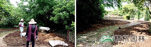 為增強(qiáng)植物后期長(zhǎng)勢(shì),現(xiàn)場(chǎng)采用杭州市園林綠化股份有限公司自主研發(fā)生產(chǎn)的易豐綠化有機(jī)基質(zhì)進(jìn)行土壤改良,改良配比為易豐綠化有機(jī)基質(zhì)體積比40%摻入原土20cm。采用翻地→撒1/2基質(zhì)→二次翻地→撒1/2基質(zhì)→澆水下沉→三次翻地模式完成土壤改良。改良后的花園入口及內(nèi)部空間感十足。