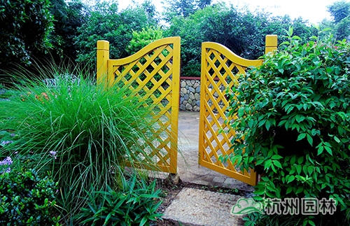門口安裝高1.2m、寬1.5m的對(duì)開推入式木門,以此吸引游人眼球;花園入口采用常綠灌木、花灌木、宿根花卉相結(jié)合的手法,將花園內(nèi)的景觀進(jìn)行了遮擋,同時(shí)營(yíng)造出引人入勝的入口景觀。