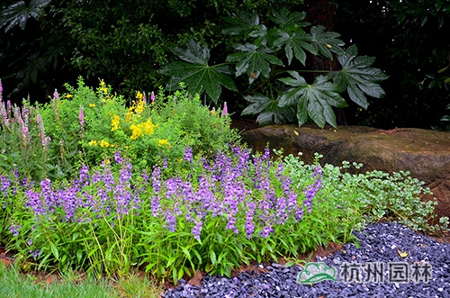 擋墻后采用柳葉馬鞭草+翠蘆莉分帶種植,并點(diǎn)綴穗花牡荊的手法,形成錯(cuò)落有序、整齊卻不單調(diào)的英式鄉(xiāng)村院落景觀。