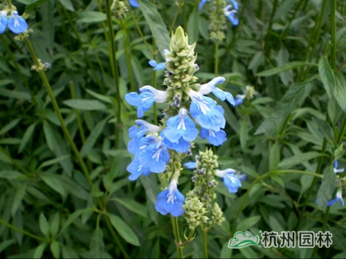 天藍(lán)鼠尾草,花天藍(lán)色,開花植株高達(dá)1米5,花期春季。喜溫暖,陽光充足的環(huán)境,不擇土壤,耐干旱,但不耐澇,特別喜石灰質(zhì)豐富、或沙性、排水良好的土壤。