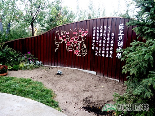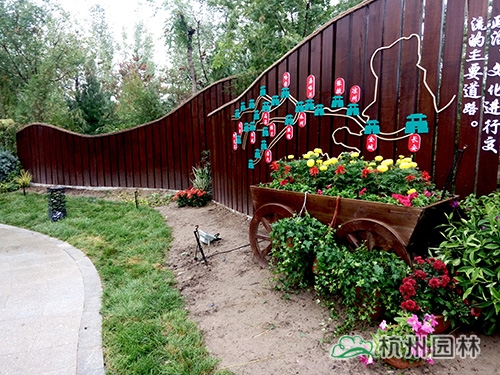 本處已有木制景墻做背景,花境施工前已在幾個節(jié)點(diǎn)放置了花車、木桶等,并栽植了一棵較高大的紅皮云杉,為花境營造創(chuàng)造了良好的條件。結(jié)合景墻上的文字、地圖,以“陸上絲綢之路”文字為分界點(diǎn),營造“絲?路”、“絲?念”兩組花境。