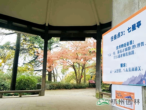 本次活動(dòng)的終點(diǎn)為玉皇山頂?shù)摹敖挥[閣”。玉皇山是杭州絕佳的觀秋景高地,站在山頂,可俯瞰杭州全城,八卦田的神秘、西湖的絢麗等盡收眼底;山上則是古樹參天,紅葉似火,黃葉賽金,彩林岑巒疊峰,如入畫里。大家從玉皇山北門上山,途經(jīng)林海亭、老玉皇宮、櫻花地、紫來洞天、七星亭,最后到達(dá)山頂?shù)摹敖挥[閣”。此次登山途中設(shè)立了3個(gè)任務(wù)點(diǎn),參加活動(dòng)人員需要完成相應(yīng)任務(wù),才能蓋章通關(guān)。
