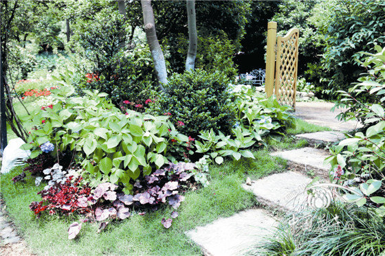 林蔭景觀 結合原有桂花,中層配植美人蕉、小葉蚊母,底層種植玉簪、落新婦、百子蓮、九頭獅子草、火炬花等,形成以粉色為主色調(diào)的林蔭景觀。