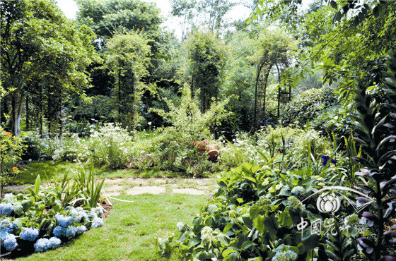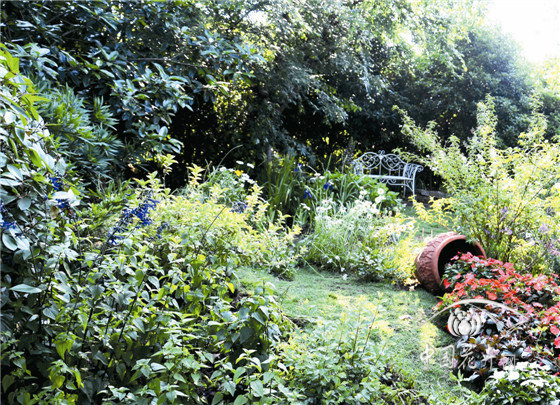 內(nèi)部八仙花花園,以櫸樹、景石、石籠擋墻及園路圍合成半開敞空間,以八仙花為主材,搭配鳶尾、石榴、落新婦、百子蓮等,組成3個花境組團,與白色座椅形成半私密的花園景觀。