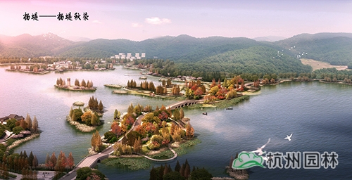 依據(jù)湘湖內(nèi)部自北向南的五堤,各堤路賦以色相植物,打造湘堤紫雨、越堤紅梅、楊堤秋染、長堤金風、賀堤碧玉。