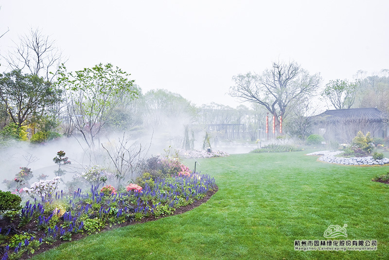 “延慶空氣干燥,而浙江園內(nèi)的植物,基本來自氣候溫潤的南方,因此,如何有效保水和增加空氣濕度,以此來提高植物的成活率和保證后期生長,是我們施工時必須要考慮的問題?!眳切〕烧f,“所以,園內(nèi)我們一共做了四套系統(tǒng),大樹根部的滴灌系統(tǒng)和樹上的噴灑系統(tǒng),大草坪的澆灌系統(tǒng),以及針對全園的霧森系統(tǒng)。”