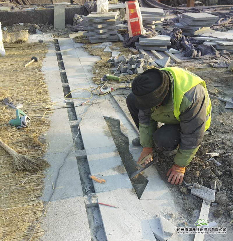 “白天溫度在零度以上時,我們趁著太陽出來、溫度比較高的時候施工;等太陽快下山時,溫度下降很快,這時,我們就停止施工,用毛氈、草墊等將做好的鋪裝蓋起來,再搭上保濕棚保溫。因為如果保暖措施做不到位,白天做好的鋪裝,晚上就會凍壞,導(dǎo)致白天的工作功虧一簣。一些種好的精品樹木,如造型黑松,我們就用很厚的棉被包裹起來,以防凍傷?!被貞浧甬?dāng)初的施工過程,吳小成依然覺得這是施工中一段時常難熬的時期,“零下15℃的時候,我們還在施工,此時水已經(jīng)全部結(jié)冰,但施工又離不開水,怎么辦呢?我們買了一個加熱器,把冰放到桶里,再把桶加溫化水,以此來滿足施工中的用水需求。”
