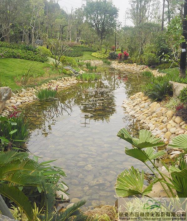 下雨時(shí)蓄水,用于植物的日常澆灌;干旱時(shí),鋪滿鵝卵石的水底又可與周邊豐富的植物營造出另一種園林意境