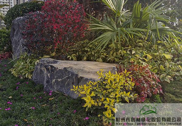 項目中應(yīng)用了許多景石,為了避免出現(xiàn)視覺的疲憊,每塊景石的形態(tài)、大小、植物配置都各有千秋。在一些入口和節(jié)點(diǎn)處,通過景石與色葉植物、開花植物、球類植物的有機(jī)搭配,營造出一個個意趣盎然的花境景觀。