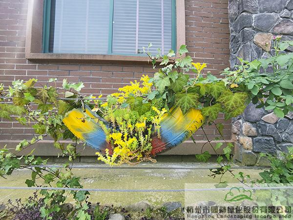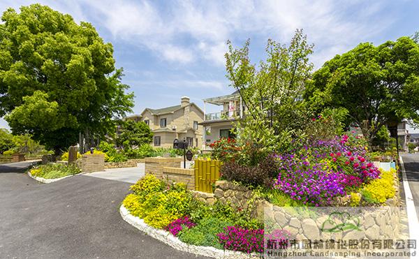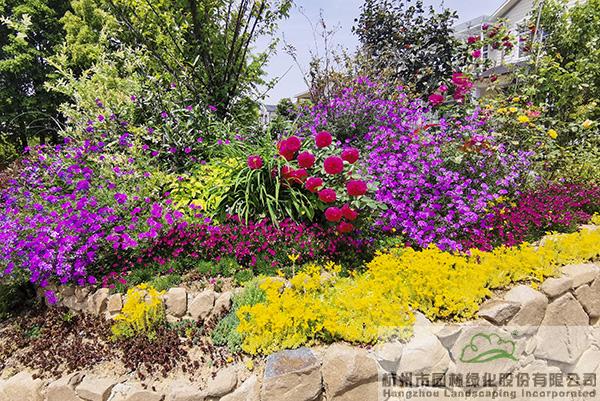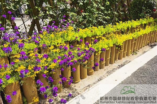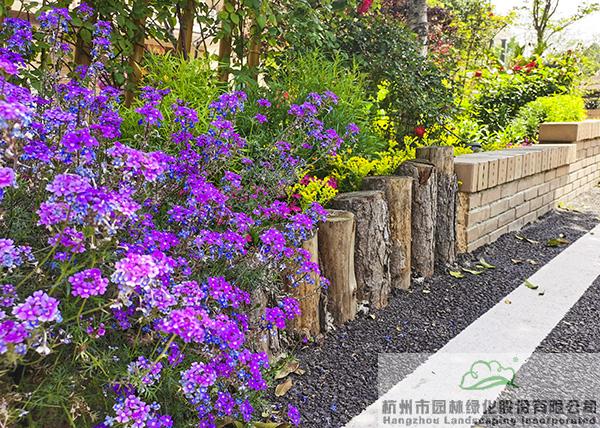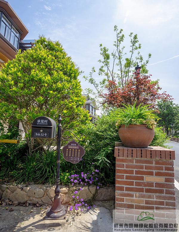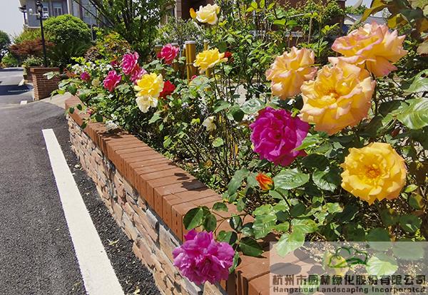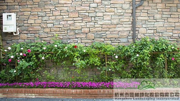 景墻邊的植物配置同樣有講究。利用銀杏、桂花、梅花、紅楓等植物營造上層空間,這些植物具有遮擋作用,能夠為庭院營造一定的私密空間。通過樹狀、球狀、攀援、傘狀、字母等各種形態(tài)的月季,金冠女貞球、龜甲冬青球、銀姬小蠟球、藍莓、八仙花、小葉梔子、翠蘆莉、花葉千鳥花、藍山鼠尾草、紫葉狼尾草等小喬灌木,在打造中層空間的同時,和美女櫻、金娃娃萱草、花葉玉蟬花、花葉香桃木、紫菀、澤蘭、礬根、五彩絡(luò)石、石竹等下層空間植物一起,裝飾和襯托景墻,使家家戶戶的景觀更加豐富多變。