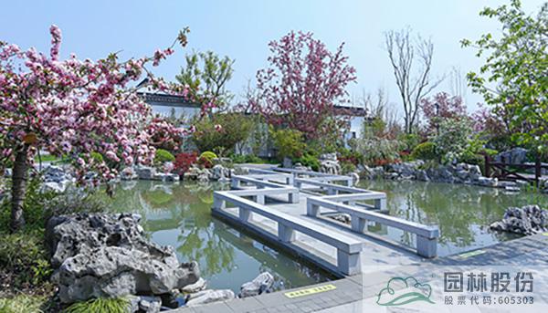 曲折的小橋將園中的水系一分兩半,一邊是平面的水面,一邊是層層跌落的流水,動靜結合,意蘊悠遠,帶給人們更加豐富的景觀體驗。而不同的植物配置手法,也讓海棠顯得更加豐姿婥約,優(yōu)美動人。