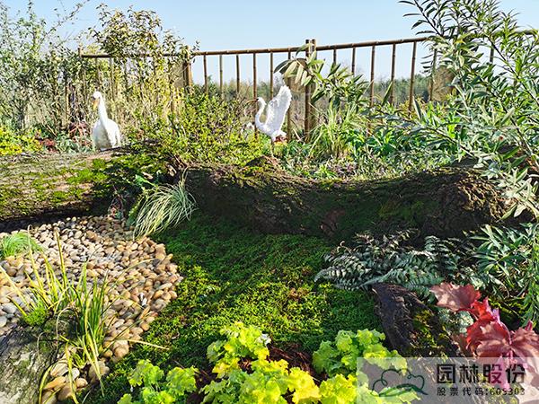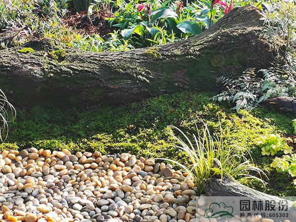 ①模擬苔蘚植物的生境條件,將蘚類濕地景觀與枯木結合,在枯木與卵石道路交叉部位布設小水塘,保持苔蘚生長環(huán)境土壤濕度。