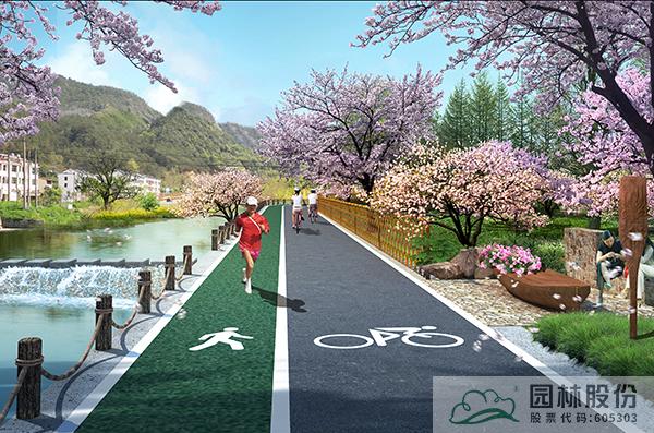 沿溪綠道為櫻花環(huán)中濱河段落,該標準段長度為730m,總長2590m。以春季櫻花為主題,打造浪漫的濱水慢行系統(tǒng),沿線打造休憩空間,設置休憩設施,并在入口處設計特色標識,成為村民通行休閑健身的浪漫步道。
