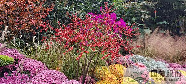 一種是未落葉的北美冬青,紅果掩映在綠色葉片中,活潑可愛。球菊和蟹爪菊都是球狀,自然舒展形態(tài)的北美冬青打破了該處單調(diào)的格局,同時也在高度上進行了過渡。