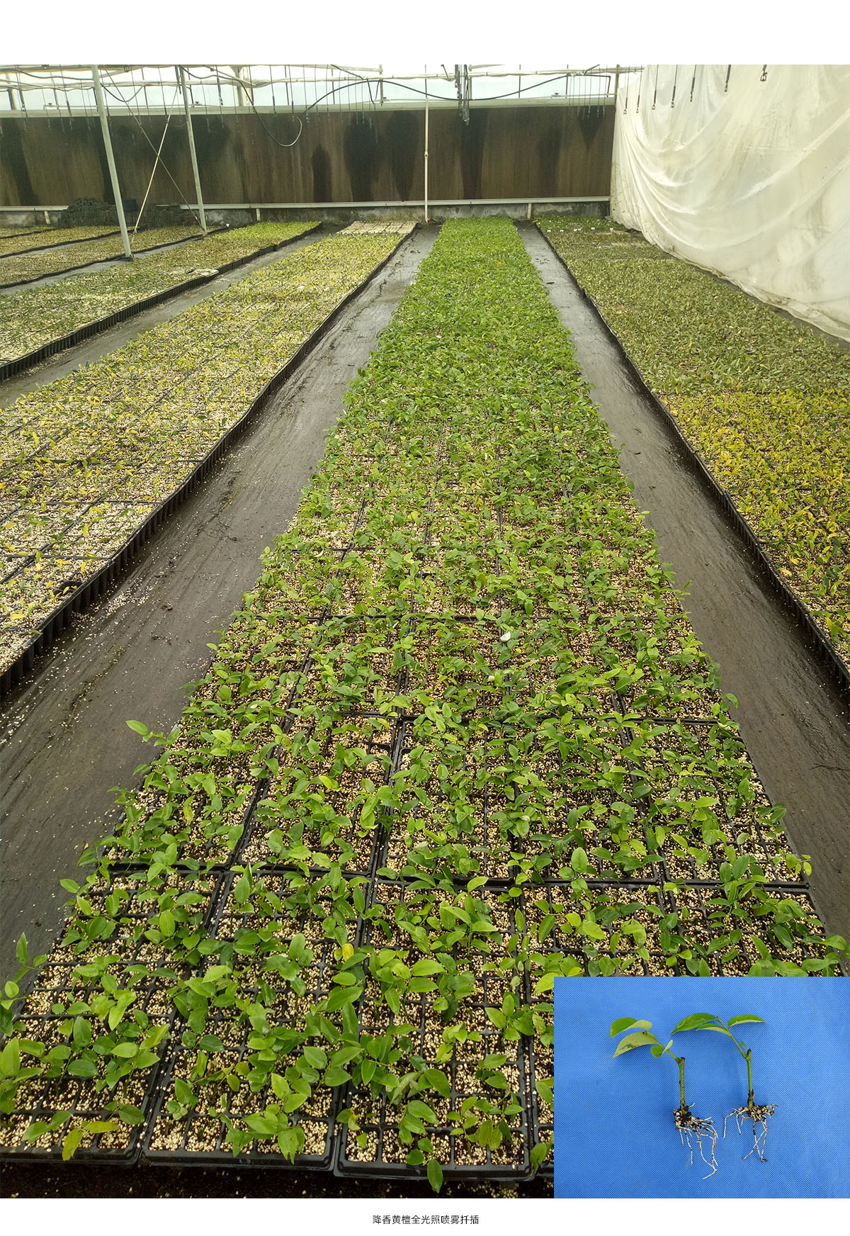 全光照噴霧扦插技術(shù)具有生根期短、成活率高和操作簡單等優(yōu)點(diǎn)。研究院已建立了桂花、冬青、降香黃檀、新優(yōu)宿根植物等數(shù)百種植物的全光照噴霧扦插技術(shù)體系,年度育苗量200多萬。
